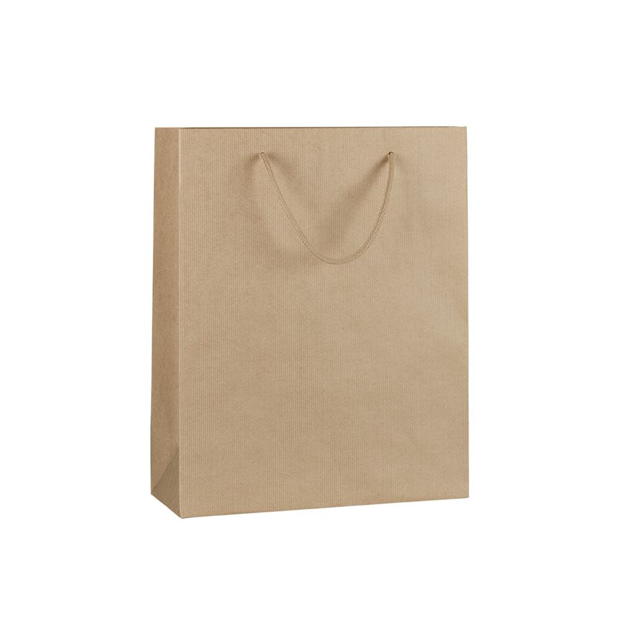 Elegantní přírodní dárková taška z pevného hnědého sulfátového (rýhovaného) papíru s kvalitními textilními šňůrkami. Taška působí moderně, minimalisticky a díky přírodnímu vzhledu je ideální pro ekologické balení dárků i firemní prezentace.