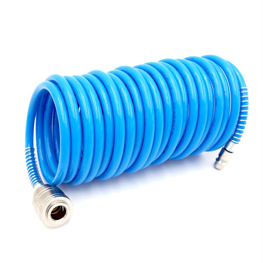 Flexibilní spirálová vzduchová hadice z polyuretanu (PU) s rychlospojkami pro kompresory a pneumatické nářadí. Odolná a prostorově úsporná. Díky svému spirálovému provedení se hadice po použití automaticky smrští, což výrazně šetří místo a minimalizuje riziko zakopnutí nebo zamotání.